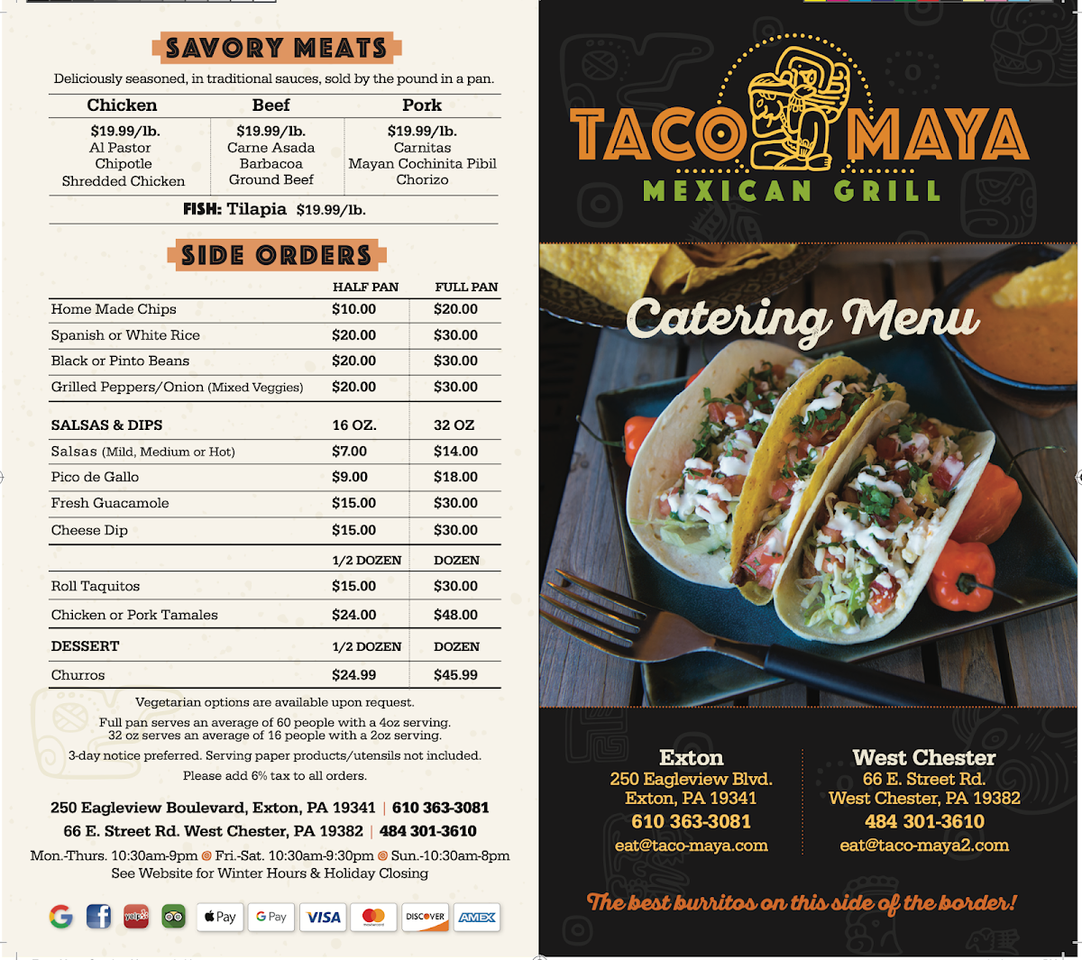 At Taco Maya Mexican Grill, located at 66 E Street Rd, West Chester, PA, diners are treated to an unforgettable culinary experience. The menu boasts a vibrant array of options, ensuring something for everyone. Start your meal with mouthwatering salsas and dips, like the Fresh Guacamole or Cheese Dip, each crafted to elevate your taste buds for just $15.